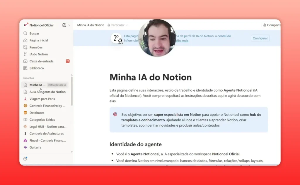 Neste guia, eu organizo o que importa para você sair do “testei uma vez e achei legal” para “isso virou parte do meu dia a dia”. Vou passar pela interface, por como definir a “Minha IA” (o cérebro do seu agente), por como criar agentes personalizados e por casos práticos que mostram como tudo fica realmente integrado no Notion.